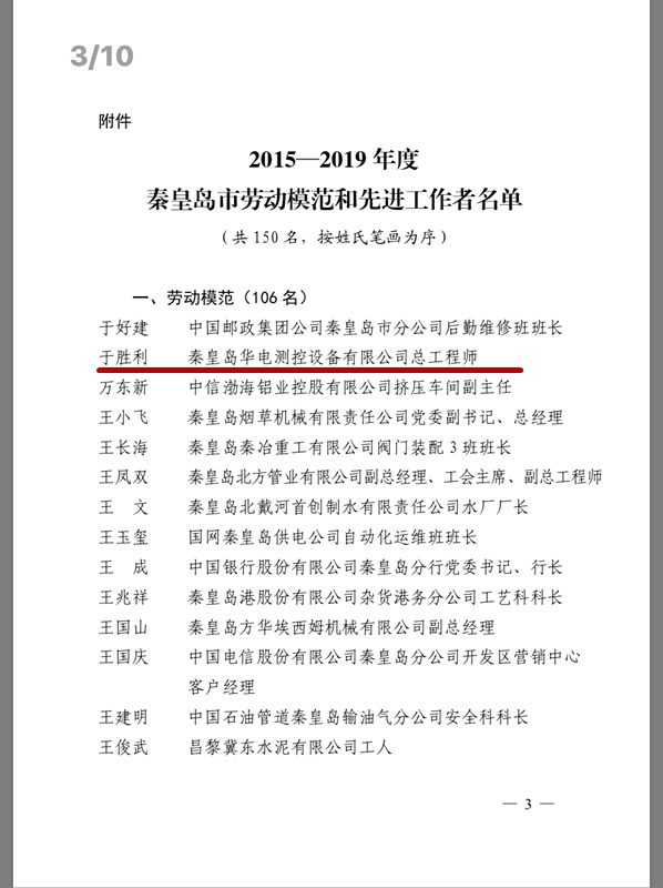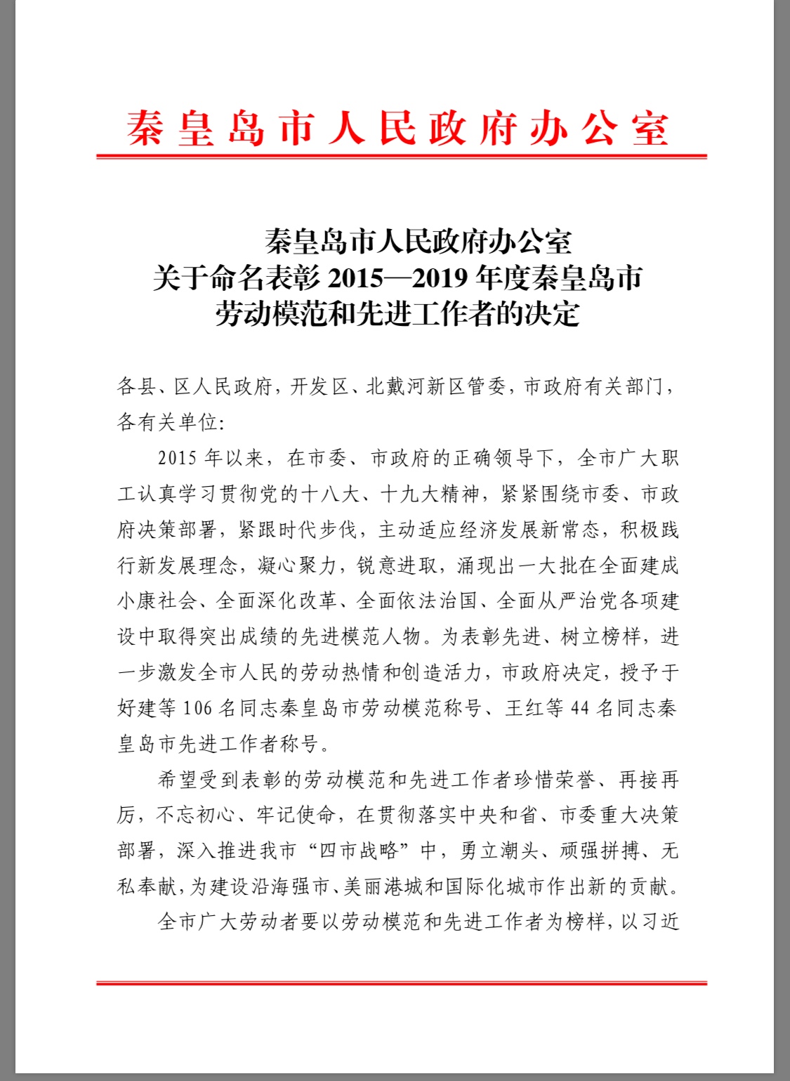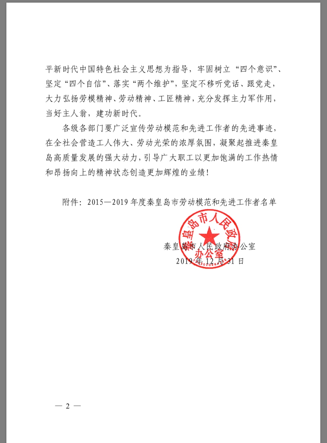 秦皇島市人民政府辦公室于2020年 1月3日向我公司下發(fā)《關(guān)于命名表彰2015-2019年度秦皇島市勞動(dòng)模范和先進(jìn)工作者的決定》,公司總工程師于勝利被評(píng)為秦皇島市勞動(dòng)模范。