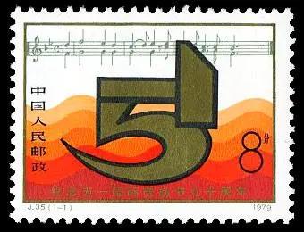 先介紹第一枚郵票,那是中國人民郵政在1979年5月1日發(fā)行的《紀(jì)念“五一”國際勞動(dòng)節(jié)九十周年》紀(jì)念郵票。該套郵票志號:J.35,全套郵票1枚,面值:8分,票名:鐮刀和鐵錘,設(shè)計(jì)者:鄧錫清。