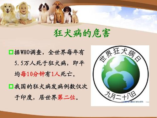 據(jù)世界衛(wèi)生組織在報(bào)告披露,狂犬病遍布于全世界,每年全球有55000人死于狂犬病,即每10分鐘就有1人死亡。此外,亞洲和非洲有1000萬人在被可能患有狂犬病的狗咬傷后,接受狂犬病疫苗注射。為了喚起全球的重視,在國(guó)際狂犬病控制聯(lián)盟的倡議下,世界衛(wèi)生組織、世界動(dòng)物衛(wèi)生組織及美國(guó)疾病預(yù)防控制中心等共同發(fā)起并確定,每年的9月28日為世界狂犬病日。通過設(shè)立世界狂犬病日,將集合眾多的合作者和志愿者,群策群力,盡快使狂犬病成為歷史。第一個(gè)“世界狂犬病日”活動(dòng)之后,各國(guó)紛紛開展相應(yīng)宣傳活動(dòng),相關(guān)的各項(xiàng)活動(dòng)獲得里程碑式的成功,將全球的狂犬病預(yù)防和控制工作向前推進(jìn)了一大步。