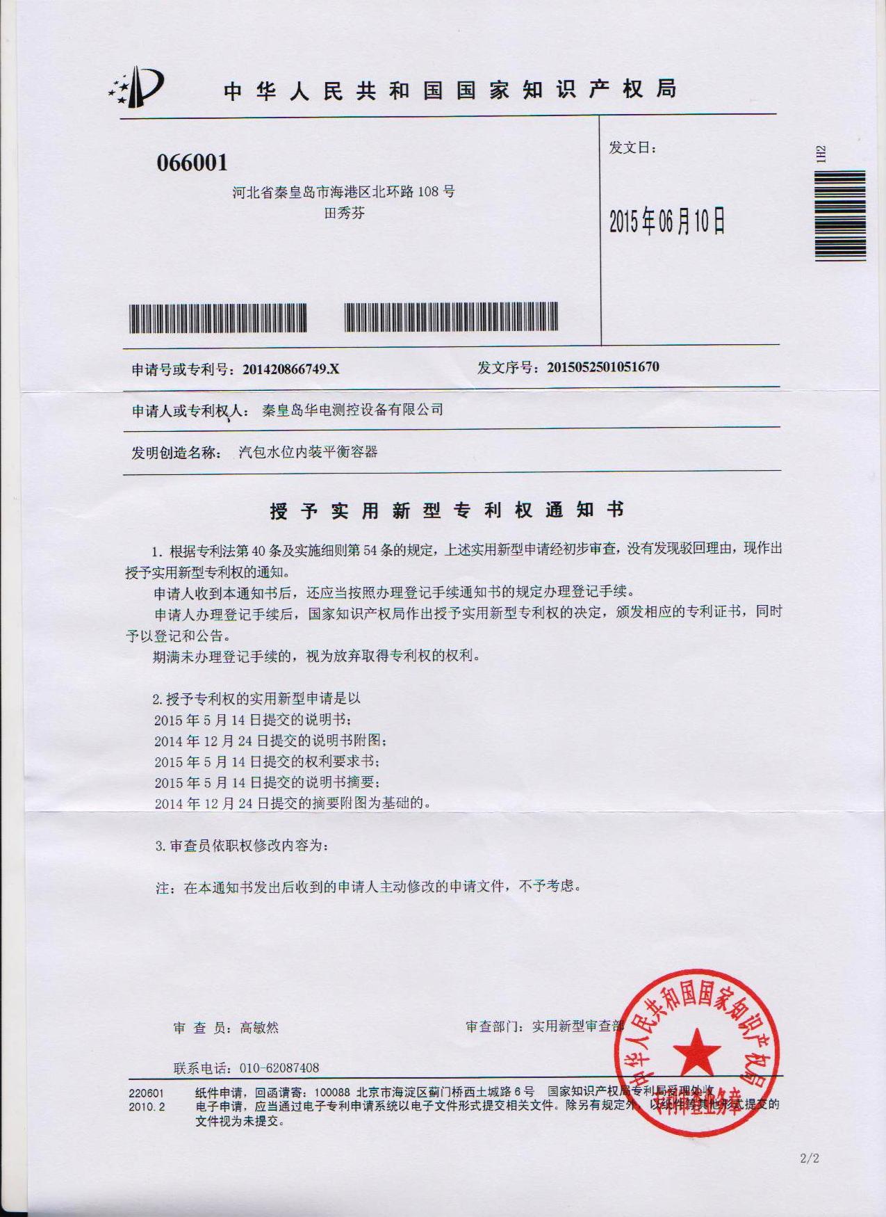 公司于2014年12月24日提交的“汽包水位內(nèi)裝平衡容器”專利已被中華人民共和國國家知識產(chǎn)權(quán)局授權(quán)實用新型專利權(quán)。
